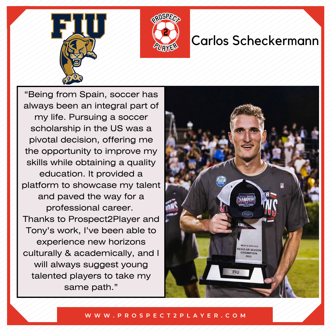 “Being from Spain, soccer has always been an integral part of my life. Pursuing a soccer scholarship in the US was a pivotal decision, offering me the opportunity to improve my skills while obtaining a quality education. It provided a platform to showcase my talent and paved the way for a professional career. Thanks to Prospect2Player and Tony’s work, I’ve been able to experience new horizons culturally & academically, and I will always suggest young talented players to take my same path.”
